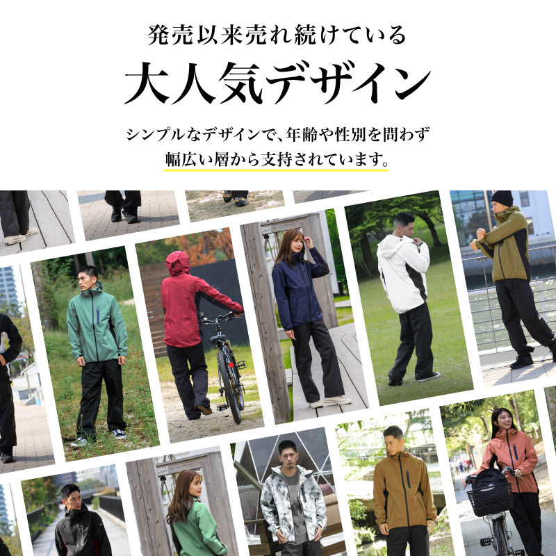 素材の伸縮性です。絶えず動きながら利用するアウトドアから、日常のちょっとした外出まで、さまざまなシーンで活躍します。絶妙なストレッチ性があるため、体の動きに追従しながらも窮屈さを感じさせません。例えば、自転車に乗る時や山道を登る時でも、ストレスを感じずに快適に活動できます。これは、従来のレインウェアでしばしば遭遇する固さや窮屈さを大きく軽減しています。